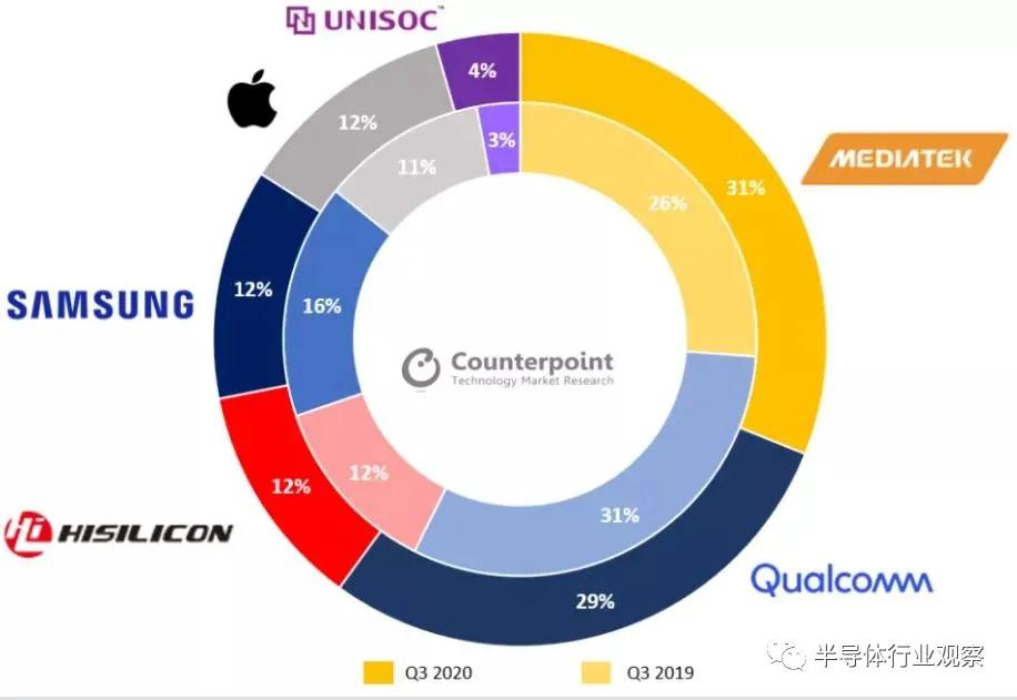 而具体到各个芯片领域,在手机芯片上,高通多年以来一直雄霸手机SoC龙头的位置。也就只在2020年第三季度联发科超越了高通。